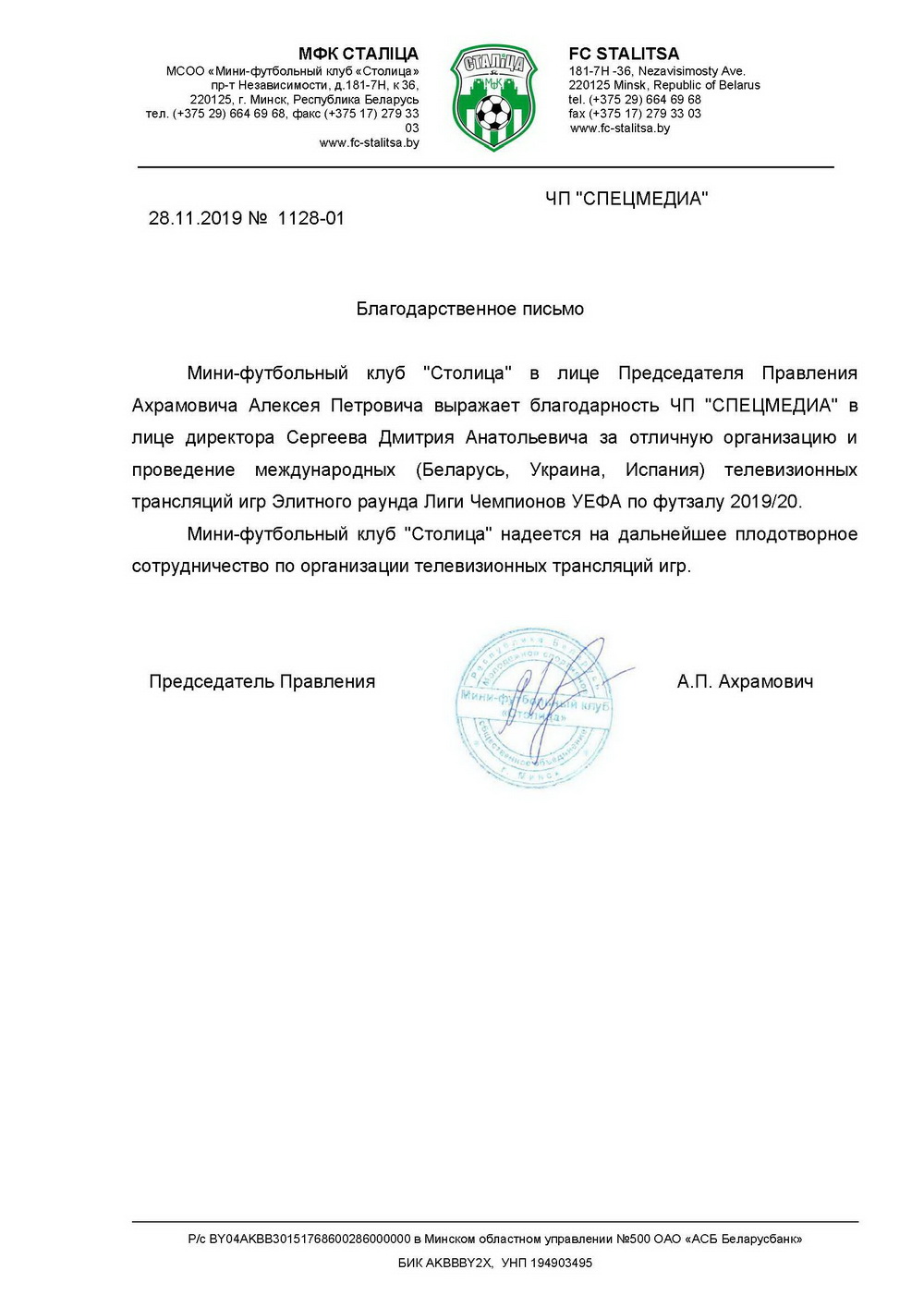 Председатель правления мини-футбольного клуба "Столица" -
