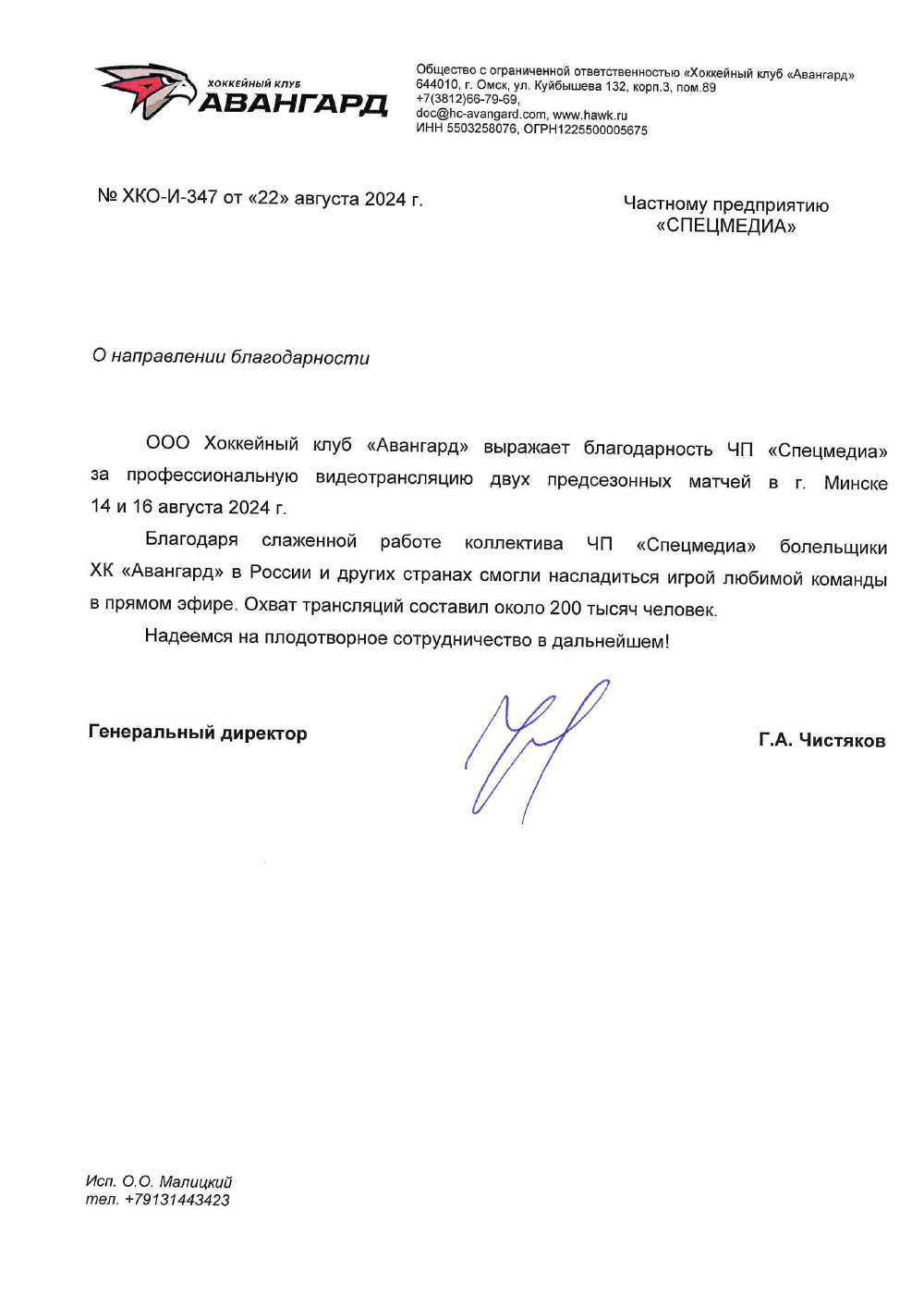 Генеральный директор "ХК Авангард" -